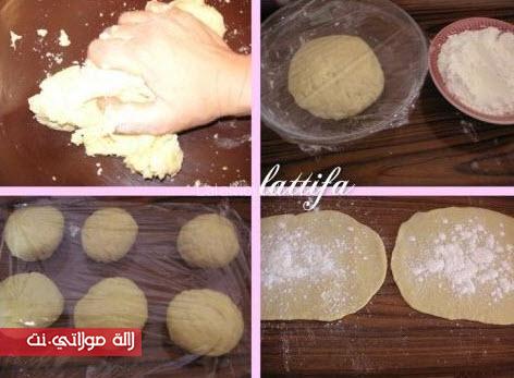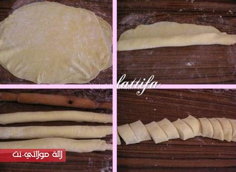 قطعي معينات على حساب 1 سنتمتر حتى واحد ونصف واضغطي عليهم باصبعك ثم بالمدلك باش تحصلي على الشكل المطلوب والسمك رقيق