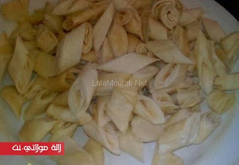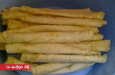 دهني الجوانب بدقيق مخلط بالماء باش تلتاصق وعمليها بحال شنيك