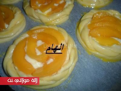ثم نحشيها بالكريمة و نضع عليها قطع الخوخ المعلب ثم نذهنها باصفر البيض مخلوط مع القليل من خل ثم تدخل للفرن لتطهى