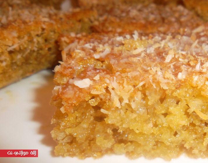 يفرغ في صينية مستطيلة مدهونة ومرشوشة بالسميدة وتدخل الى الفرن