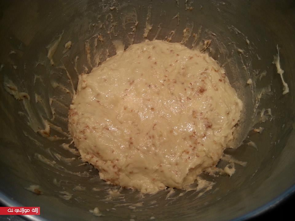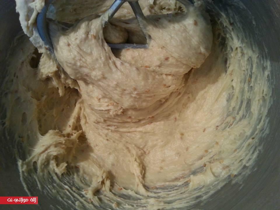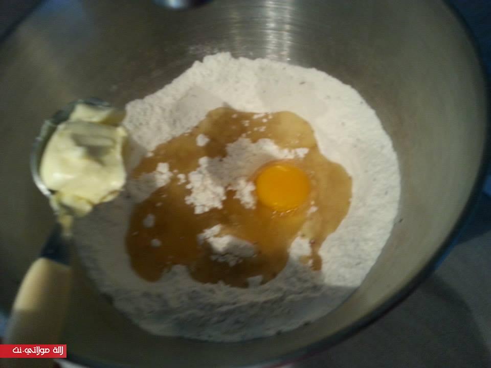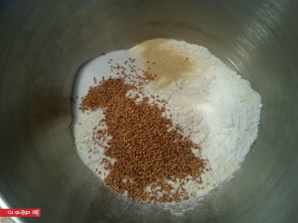 -نعمل كل النواشف الطحين الملح السكر الفاني الجنجلان نخلط هادو من بعد نضيف الزيت البيضة الزبدة نخلط من جديد ونضيف الخميرة ثم نجمع بالحليب ونتركها تعجن مزيان