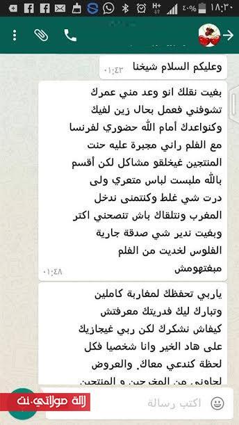 بعد أن كذبت تصريحاته حول اتصالها به وطلب النصح والتوبة، نشر الشيخ محمد الفيزازي الرسائل التي بعثتها إليه الممثلة لبنى أبيضار عبر الواتساب، حول توبتها ورفضها أداء أدوار مشابهة للدور الذي أدته في فيلم “الزين اللي فيك”.