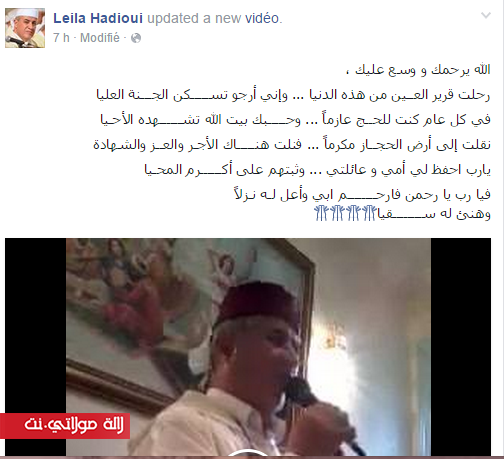 نشرت الفنانة والعارضة المغربية ليلى الحديوي، منشورا ترثي فيه روح والدها نور الدين الحديوي مؤذن مسجد الحسن الثاني بالدار البيضاء، الذي قضى في فاجعة منى، ويتضمن أبيات شعرية في حقه، أرفقته بمقطع فيديو لوالدها وهو يرتل سورة “القيامة” بصوته الشجي.
