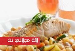 احضرى طبق التقديم ويوضع فيه الأرز ثم السمك على الوجه مع حمص الشام