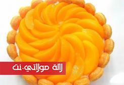 خامسا نضع طبقة اخرى من الكريمة بحيث تغطى البسكويت كله ثم نزين الوجه بالمانجو المقطعة شرائح نضعها على شكل وردة