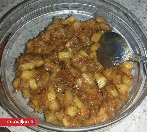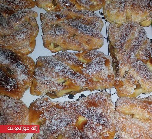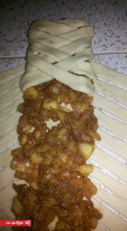 في قصعة نوضع زﻻفة عامرة فورص ملح 2م سكر كﻻصي 2م زبدة بيضة1 نضيفو خمير لخمرن في زﻻفة نضيف نص كاس حليب دافي نجمعها ندهنوها بملعقة زيت نغطيوها ونخليها ساعة نحضرو تفاح في مقلى نوضع 6 تفاحات منقي مقطع مربعات صغار نضيف 2م مربى قشرة ليمون 1م قرفة 2م زبدة كاس زبيب مقطع 1م سنيدة مدة 10 دقيقة على نار مهيلة دبة كولشي