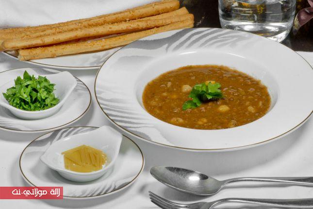 5. يُسخّن الخليط المهروس ويثضاف اللحم فوقه.ويُقدّم حساء الحريرة ساخناً، ويُزيّن بالبقدونس المفروم ناعماً.