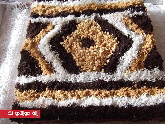 عندما تبرد الطورطة نزيلها من القالب، ونجهز القليل من البيسكويت المهروش جيدا الأول نتركه بلونه الطبيعي والتاني نأخذ الطبيعي ونضيف إليه القليل من بودرة الكاكاو المر أو نستخدم قطع من بيسكويت “الاوريو” الأسود اللون، وكذلك نحتاج للقليل من الكوك والقليل من اللوز المحمر والمهروش ونزين كما في الصورة باستعمال مسطرة وعمل كل خط في لون حتى الحصول على صورة زربية أو ما يسمى بالسجاد