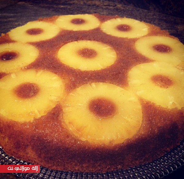 1. نضع 3 – 4 ملاعق من الزبدة الذائبة مع السكر الناعم في قالب الجاتو على النار حتى يصبح لونها بنيّاً ثم نضع شرائح الأناناس فوقها.