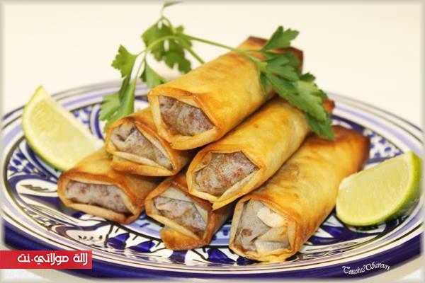 نفرد ورقة البسطيلة ونقطعها على شكل مثلث ونحشيها بالحشوة وتلف على شكل سيكار.