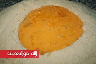 2. نضيف البيض المخفوق وعصير البرتقالة وماء الزهر، ونستمر في الخلط حتى نحصل على عجين متجانس