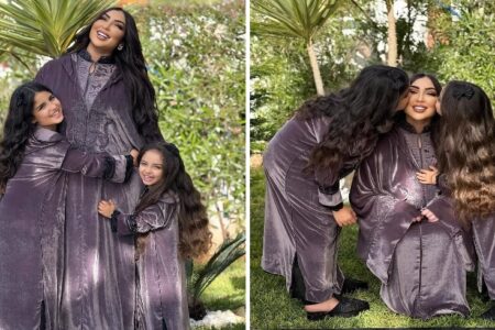 جاءت الإطلالة التي ظهرت بها دنيا بطمة رفقة ابنتيها متميزة بتصميم تقليدي أنيق للجلابة المغربية، حيث كانت القطعة مكونة من جزأين؛ الجزء السفلي جاء باللون الأسود الغني والجزء العلوي باللون البنفسجي الداكن المصنوع من قماش الموبرة الفاخر. هذا الاختيار منح الإطلالة توازناً مميزاً بين الرصانة والفخامة، ما زاد من جمالية الصور التي لاقت تفاعلاً واسعاً من جمهورها.